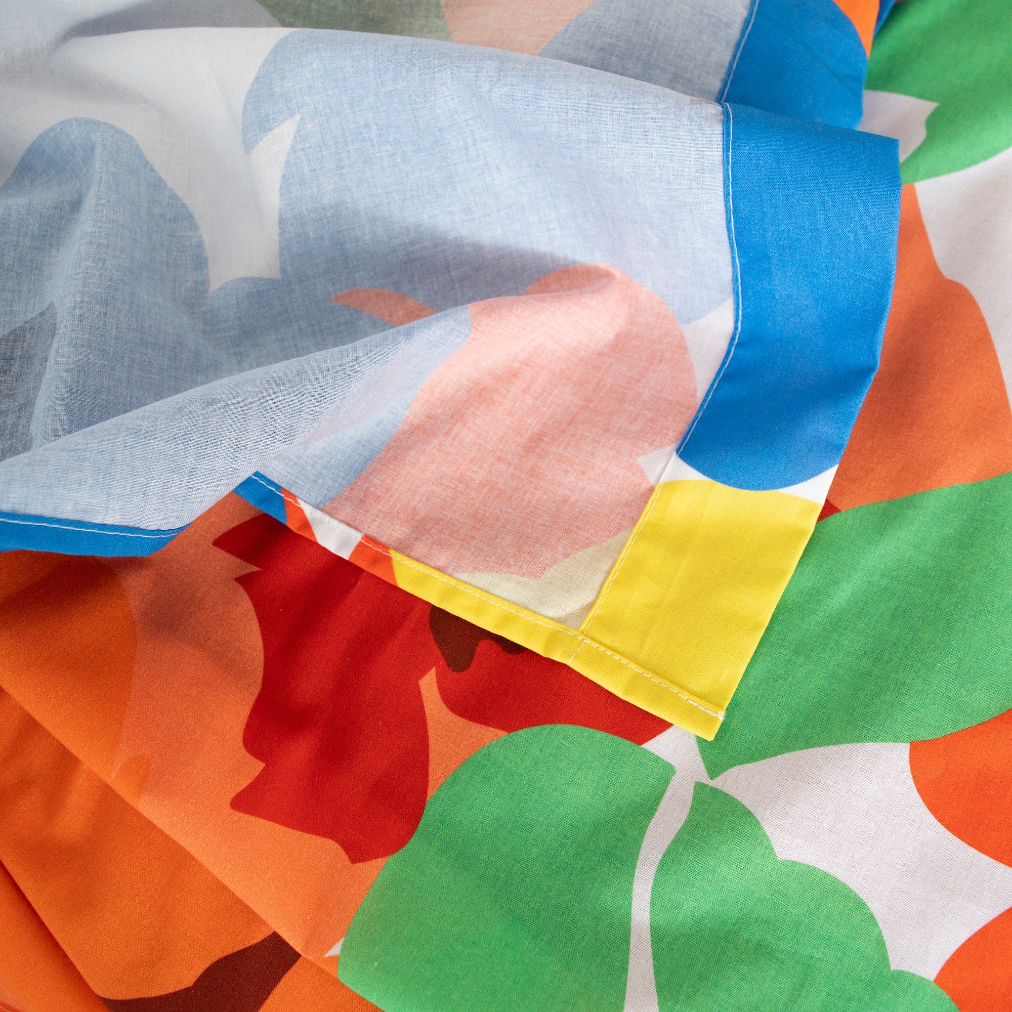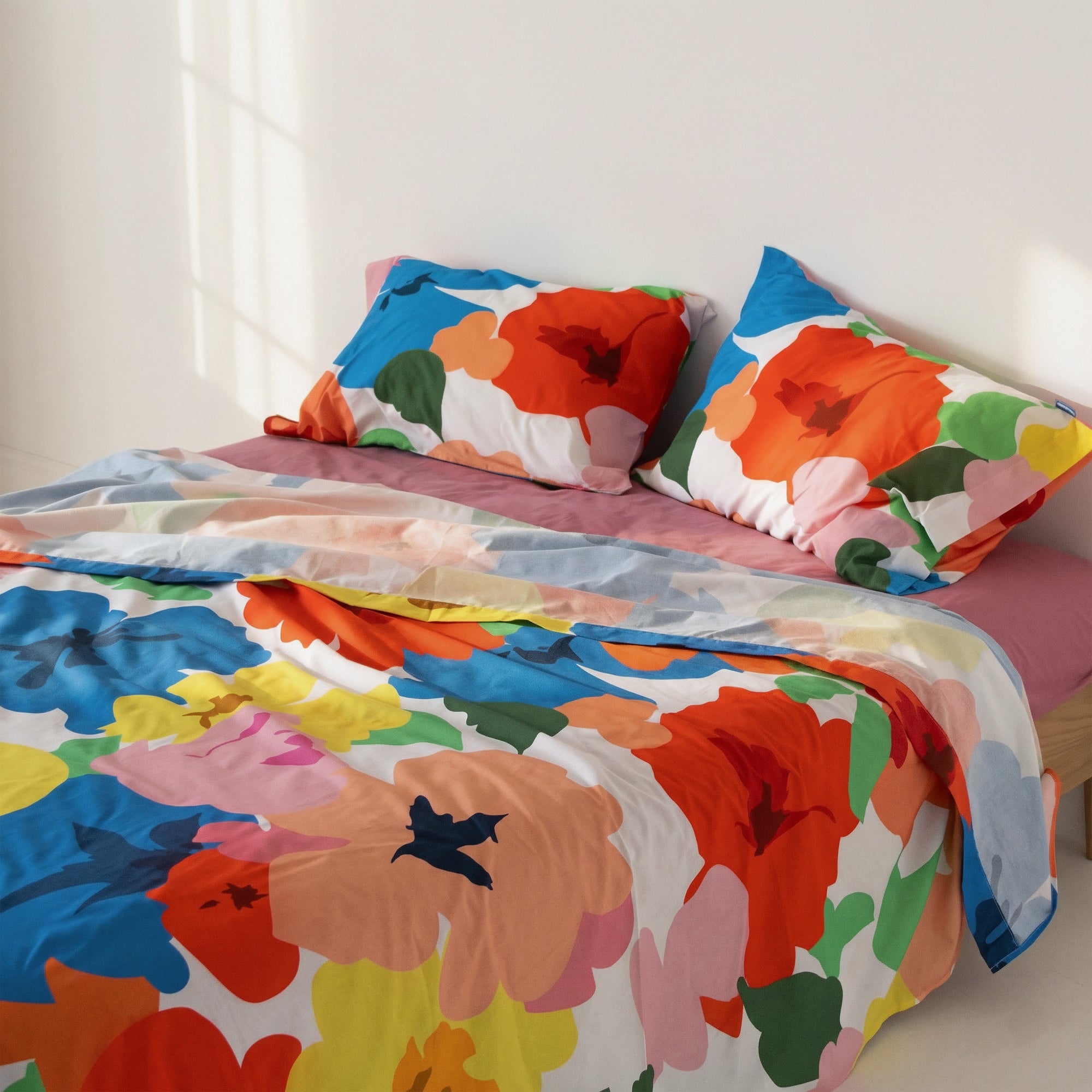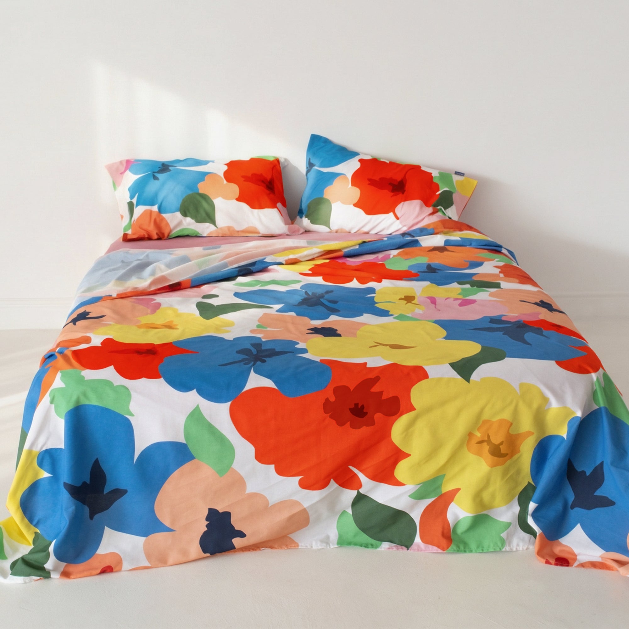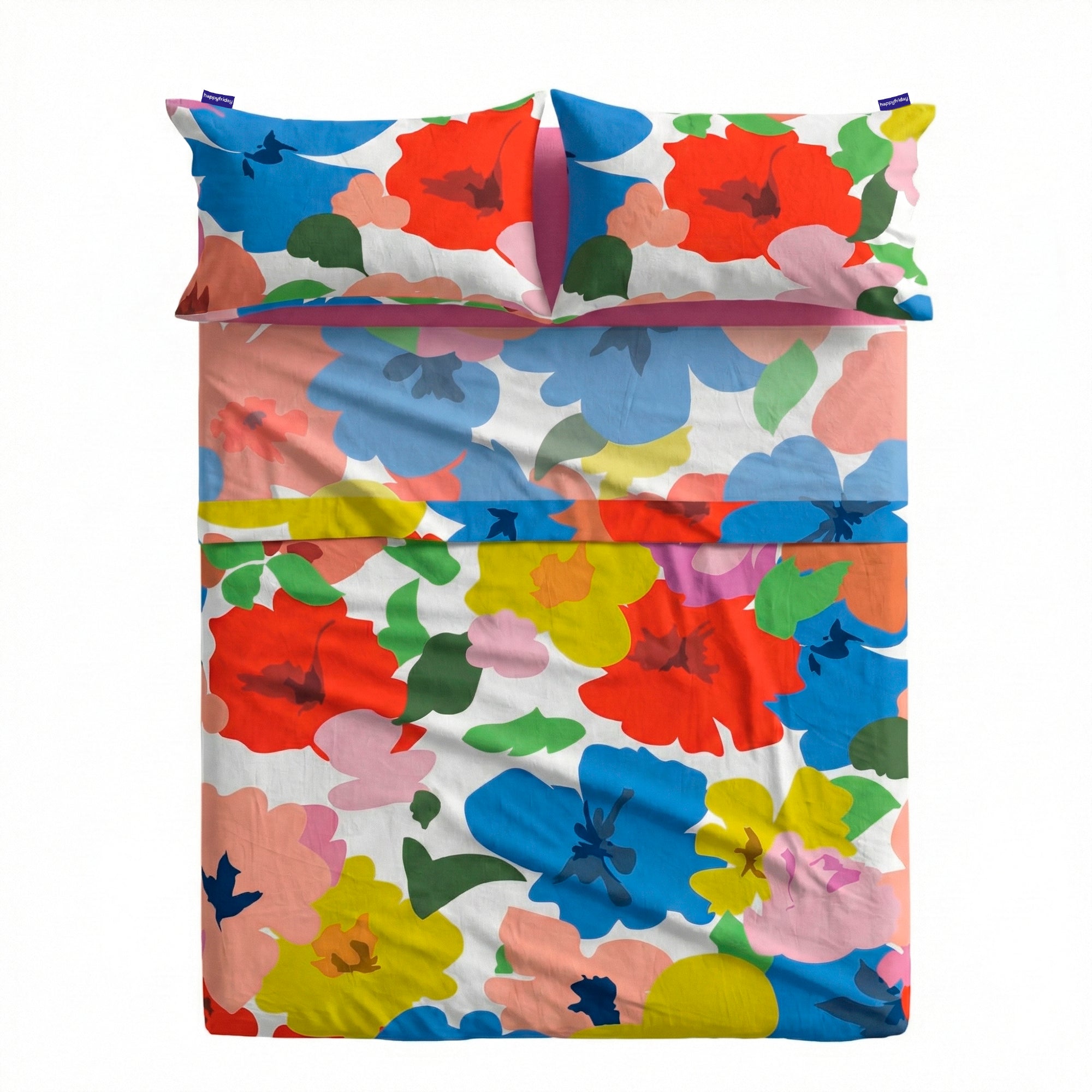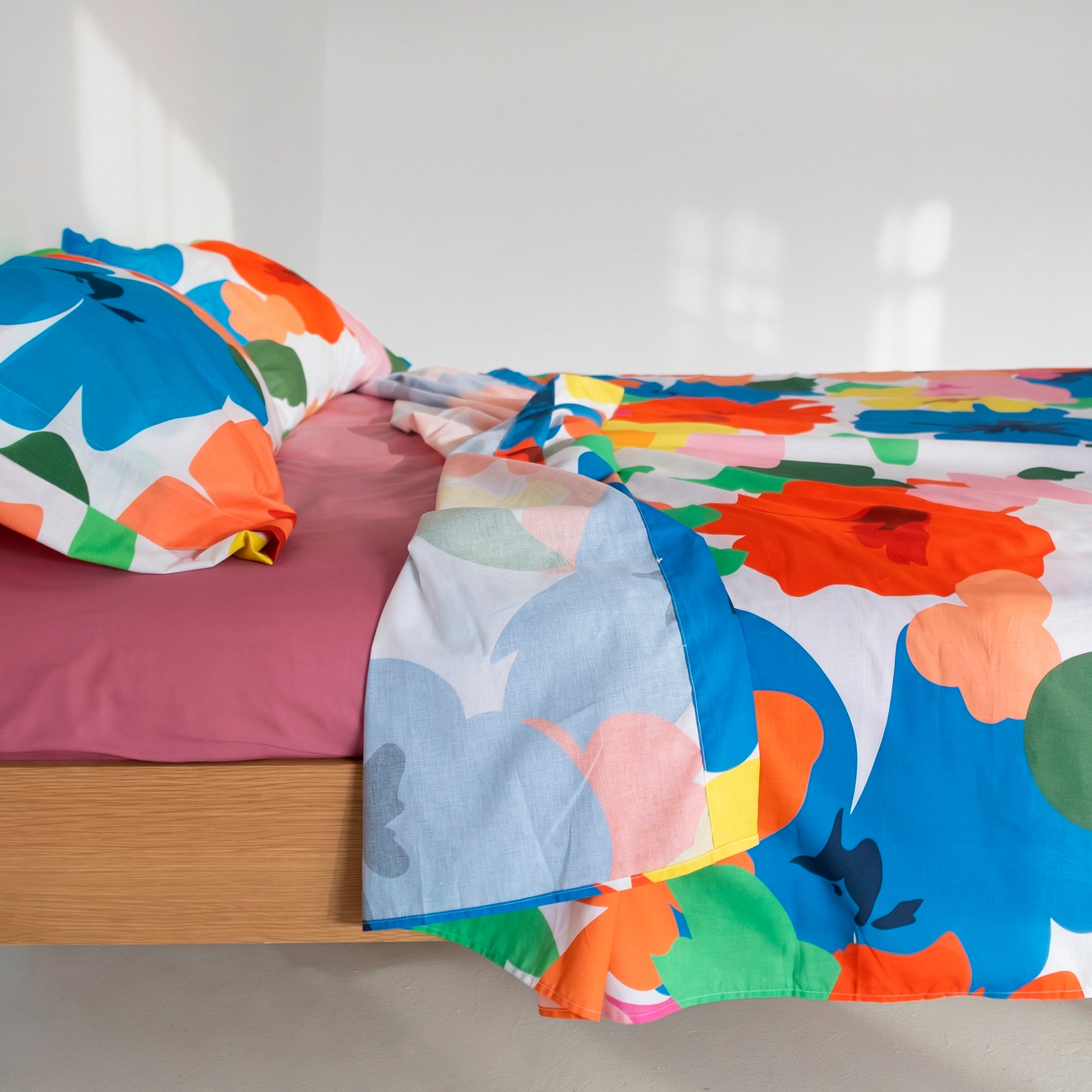 Die Bloom Play Bettlaken bringen Energie und Originalität ins Schlafzimmer. Das abstrakte Blumenmuster mit freien Pinselstrichen und lebendigen Farben verwandelt dein Bett in eine künstlerische Komposition – frisch, individuell und mit einem verspielten Akzent.