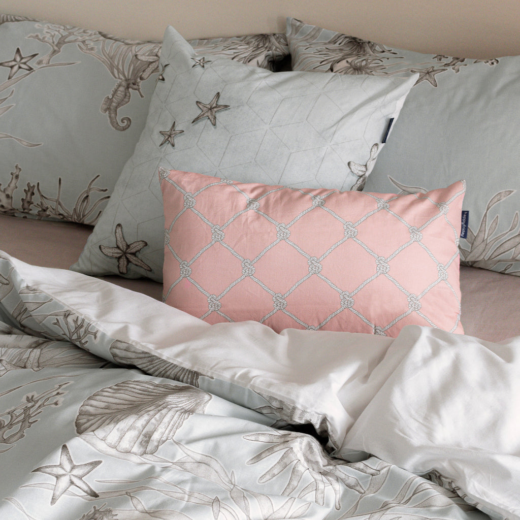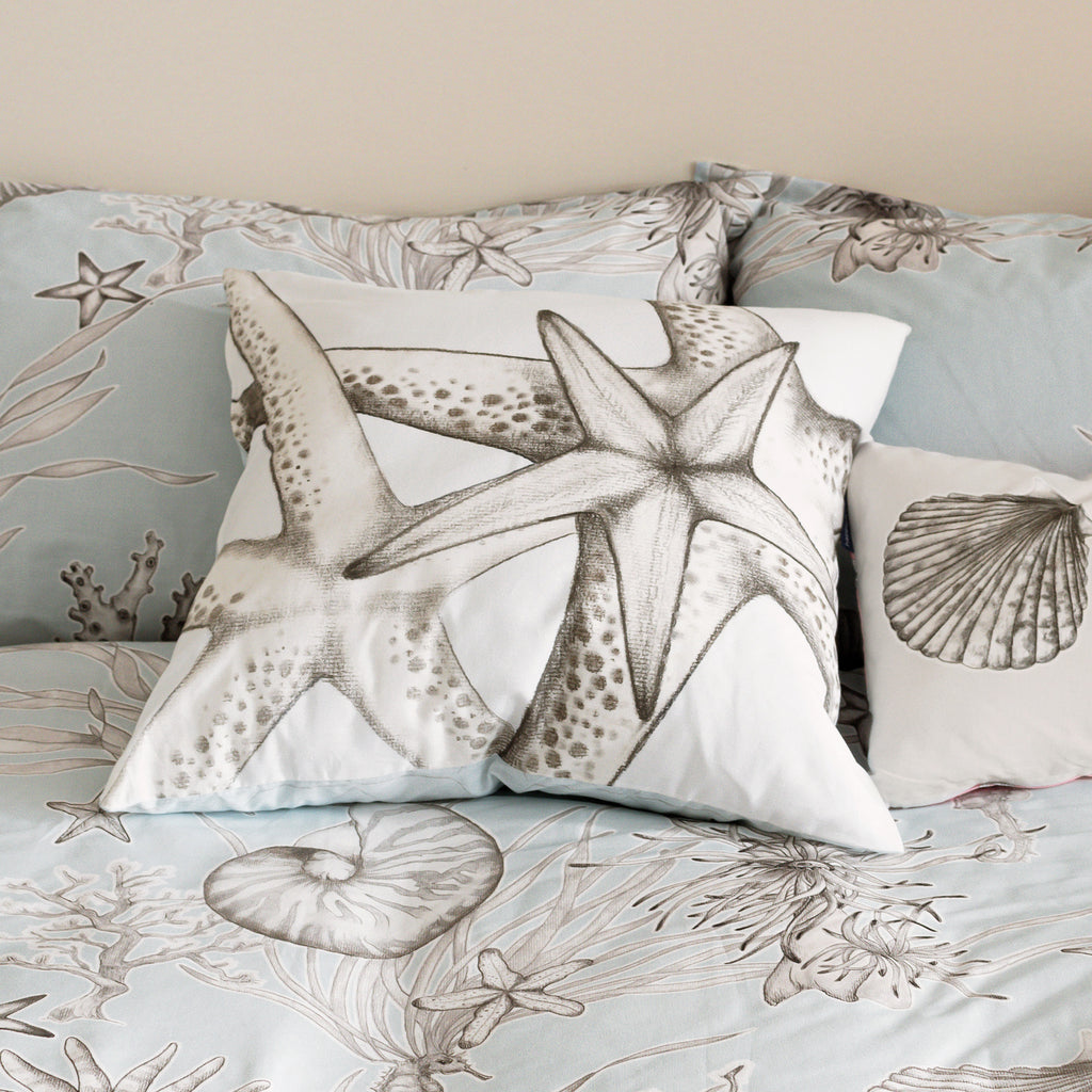 Detailed shell and starfish pencil illustrations combined with rope patterns on salmon pink make Happyfriday’s Coral Reef Cushion Cover set the perfect addition to any beach or nautical inspired bedroom.