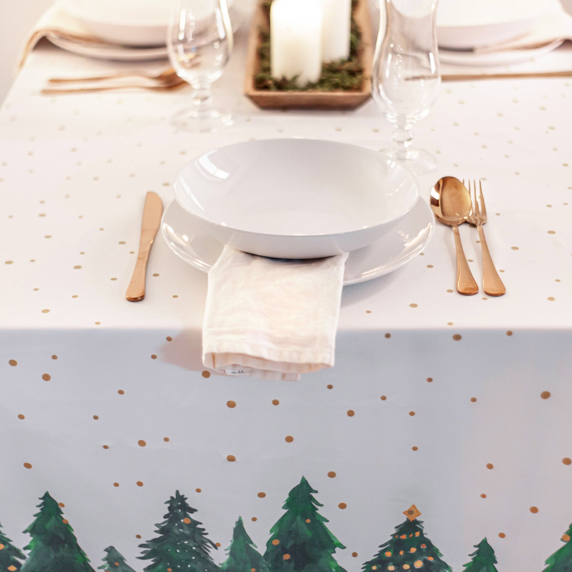 Laissez l'esprit de Noël envahir votre pièce en habillant la table avec les magnifiques illustrations d'arbres à l'aquarelle de la housse de table Sapin de la collection Happy Xmas.