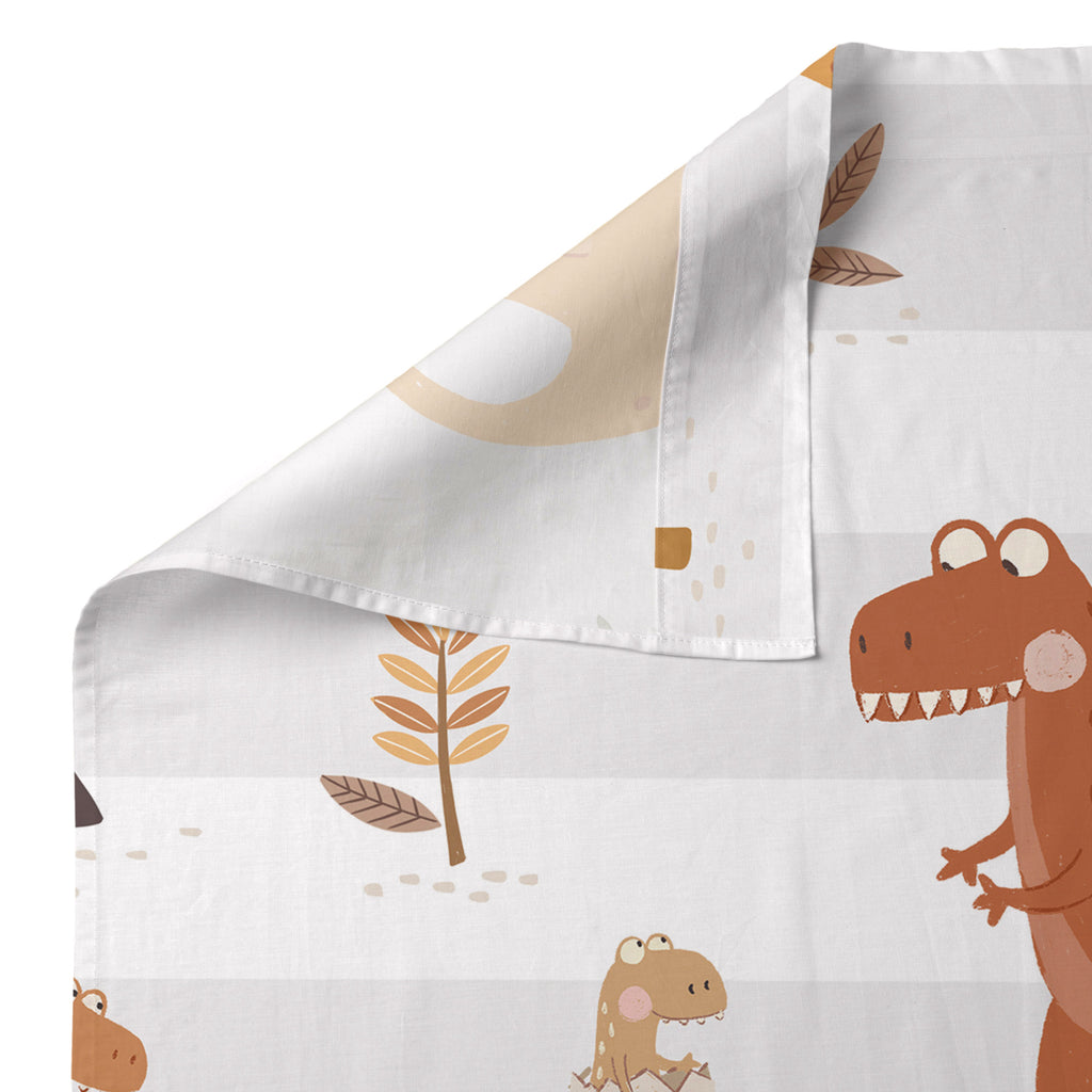 Questo design presenta una combinazione di elementi che non potremmo amare di più. Una divertente famiglia di dinosauri in colori caldi, su strisce bianche e grigie che danno un tocco moderno e sofisticato. Questo set di lenzuola è perfetto per tutti gli amanti di questi animali preistorici.