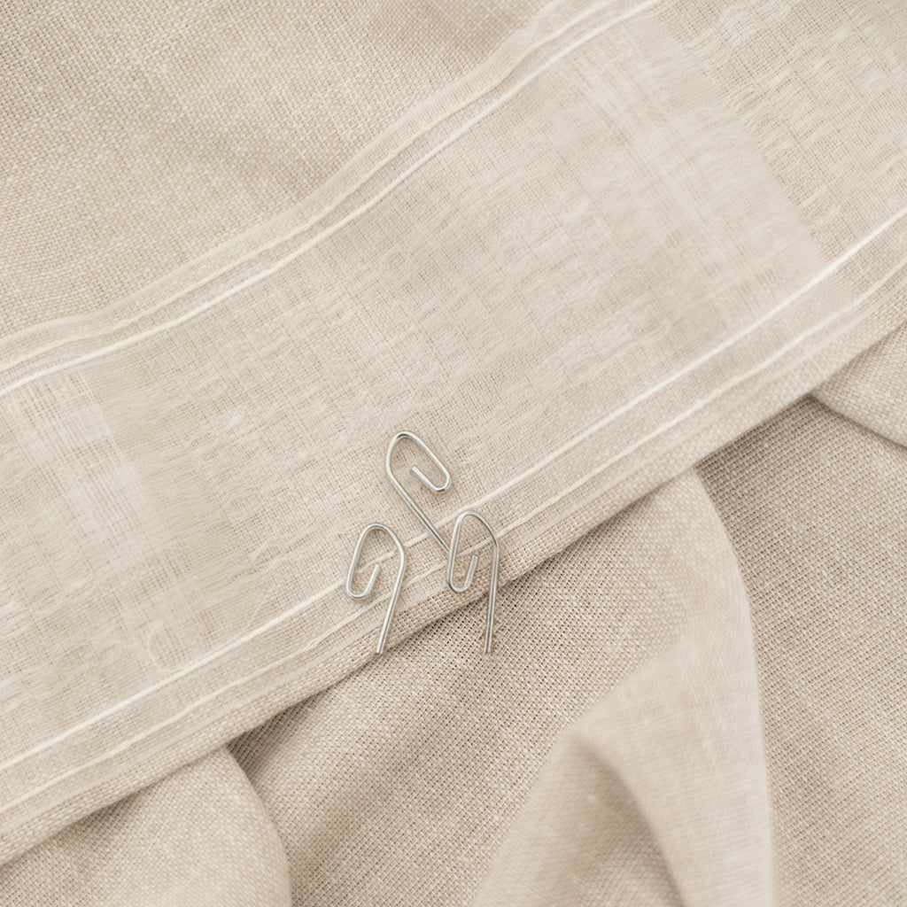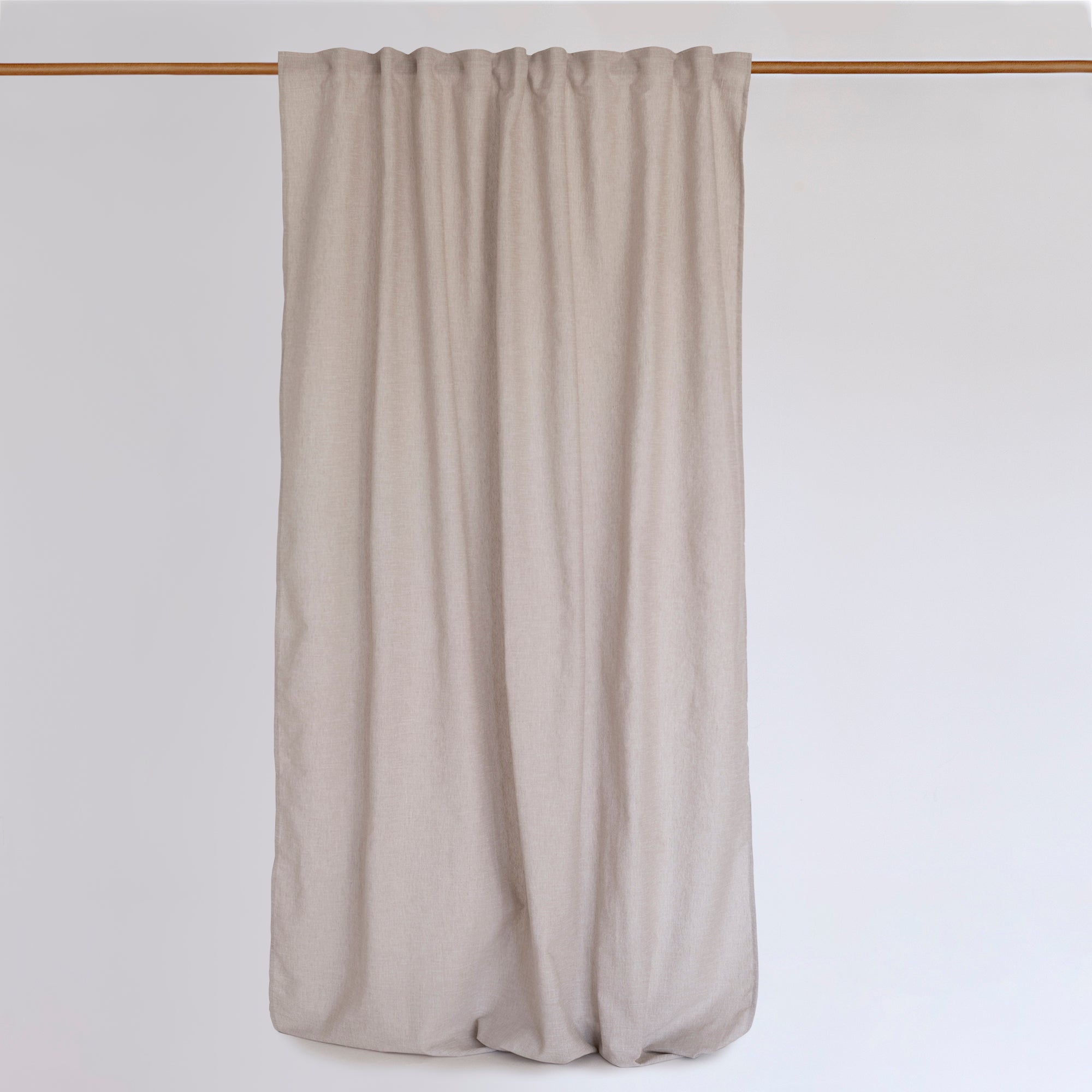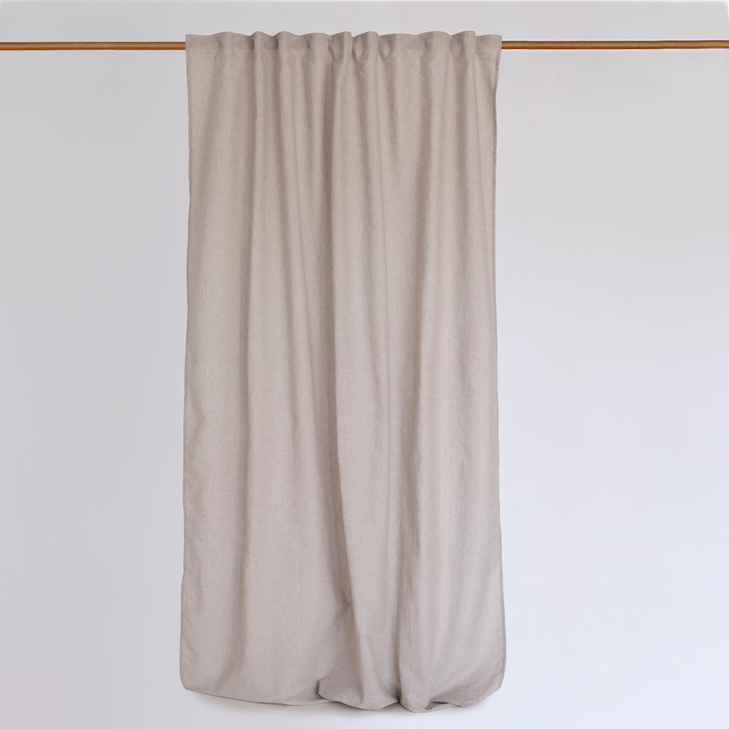 Confezionata con fettuccia multiuso, può essere appesa con ganci su binario o tramite passanti nascosti su barra, adattandosi a diversi sistemi.