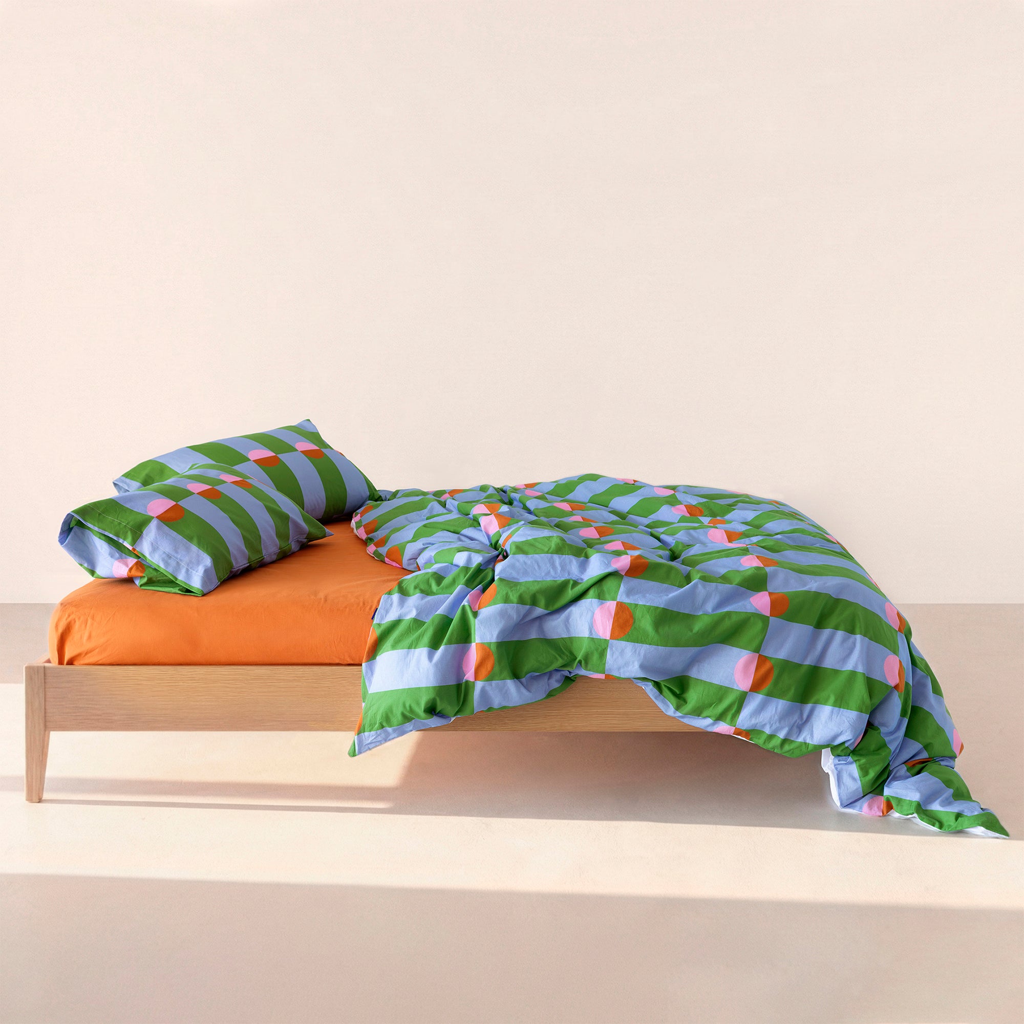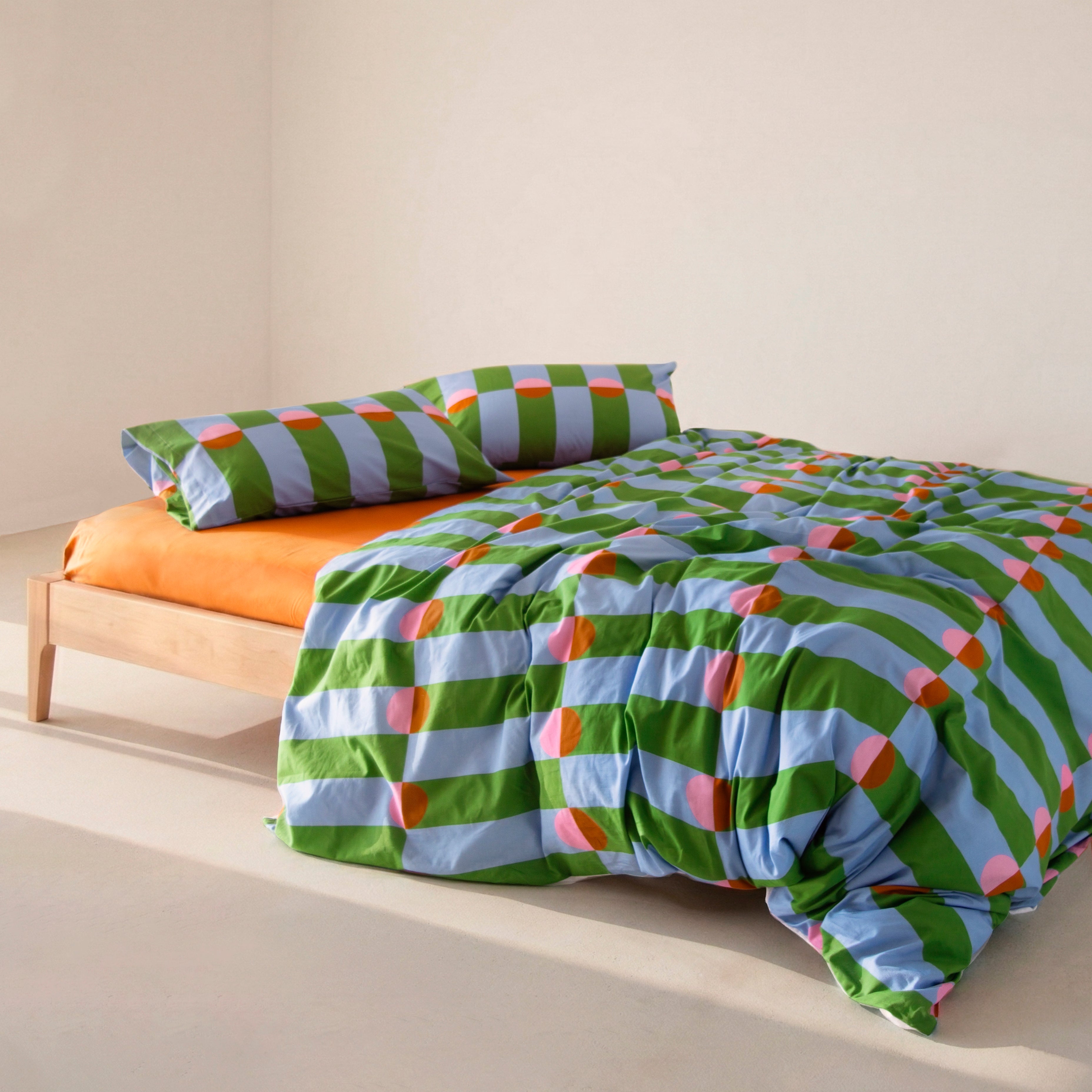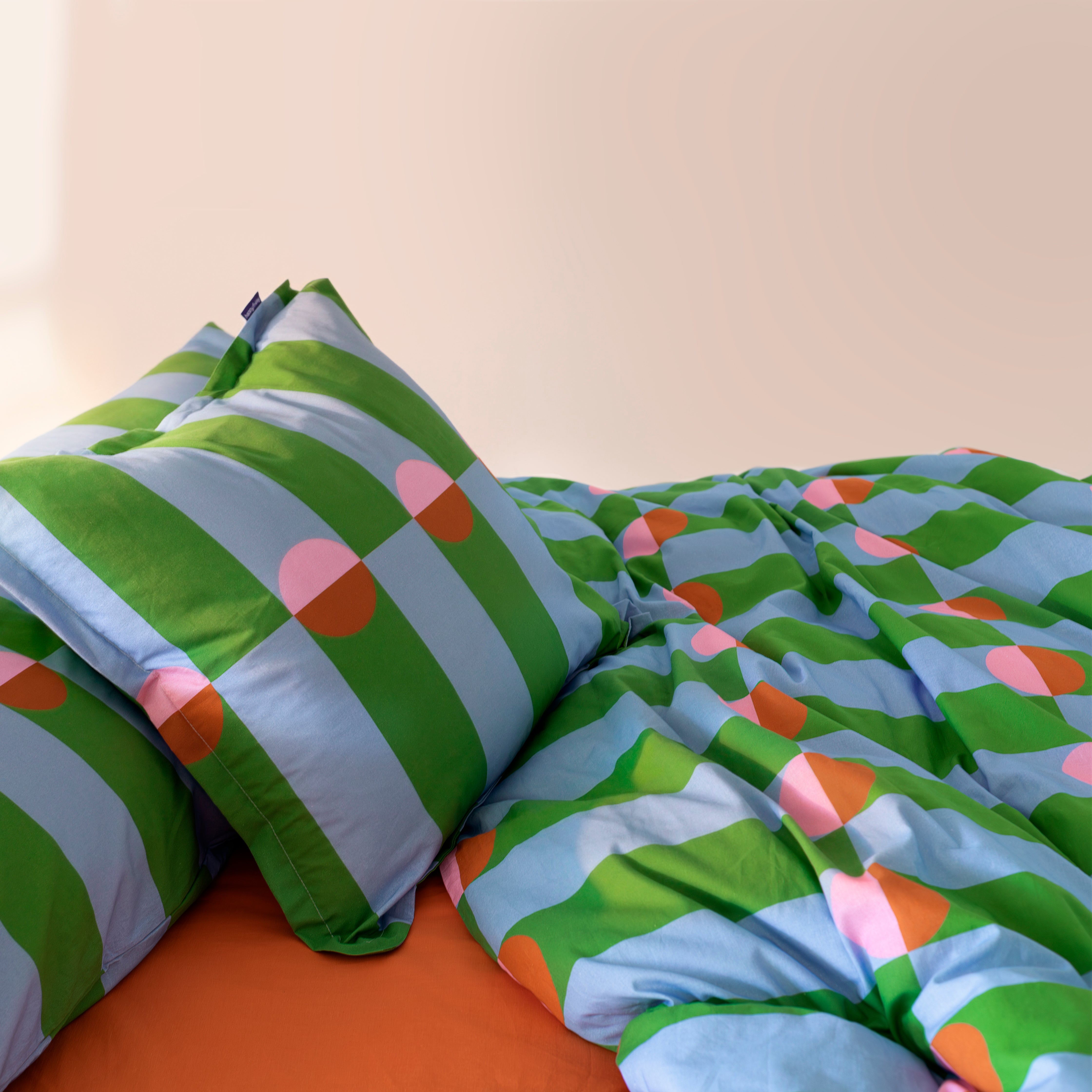 Boogie propone un juego visual de formas y contrastes que hipnotiza. Su patrón gráfico, basado en franjas verticales y semicírculos de color, genera una sensación de movimiento constante, como una pista de baile en pleno auge. Una pieza con energía, actitud y referencias retro reinterpretadas con mirada actual.