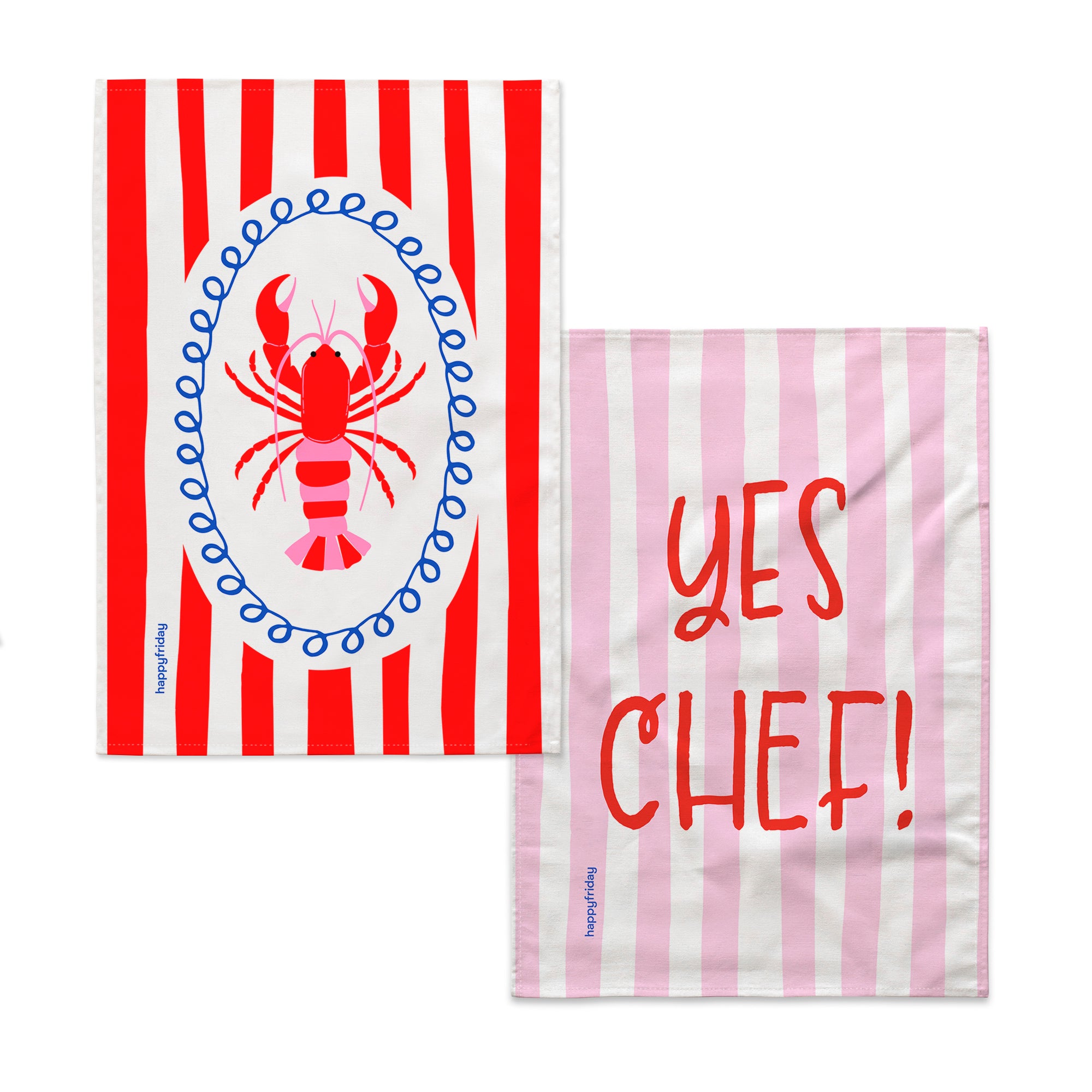 Un dúo divertido que combina un paño con rayas rojas y una ilustración de langosta, y otro con rayas rosas y el mensaje “YES CHEF!”. Dos diseños que aportan alegría a tus recetas y estilo a tu cocina.