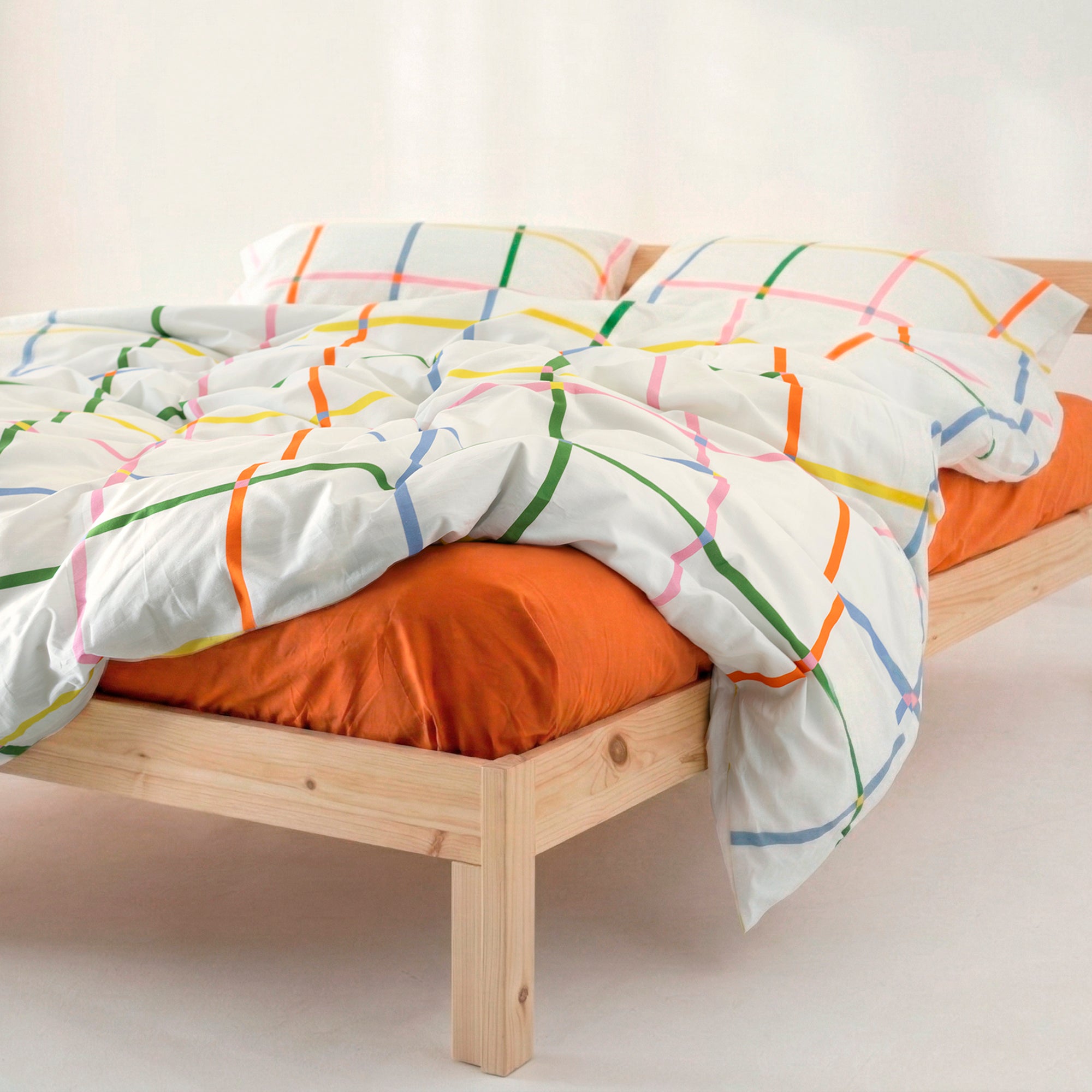 Color Lines apuesta por una composición limpia y alegre que juega con líneas rectas, intersecciones cromáticas y un fondo suave. Cada trazo parece dibujado a mano con precisión optimista, creando un efecto gráfico que transforma la cama en una pieza moderna y llena de intención.