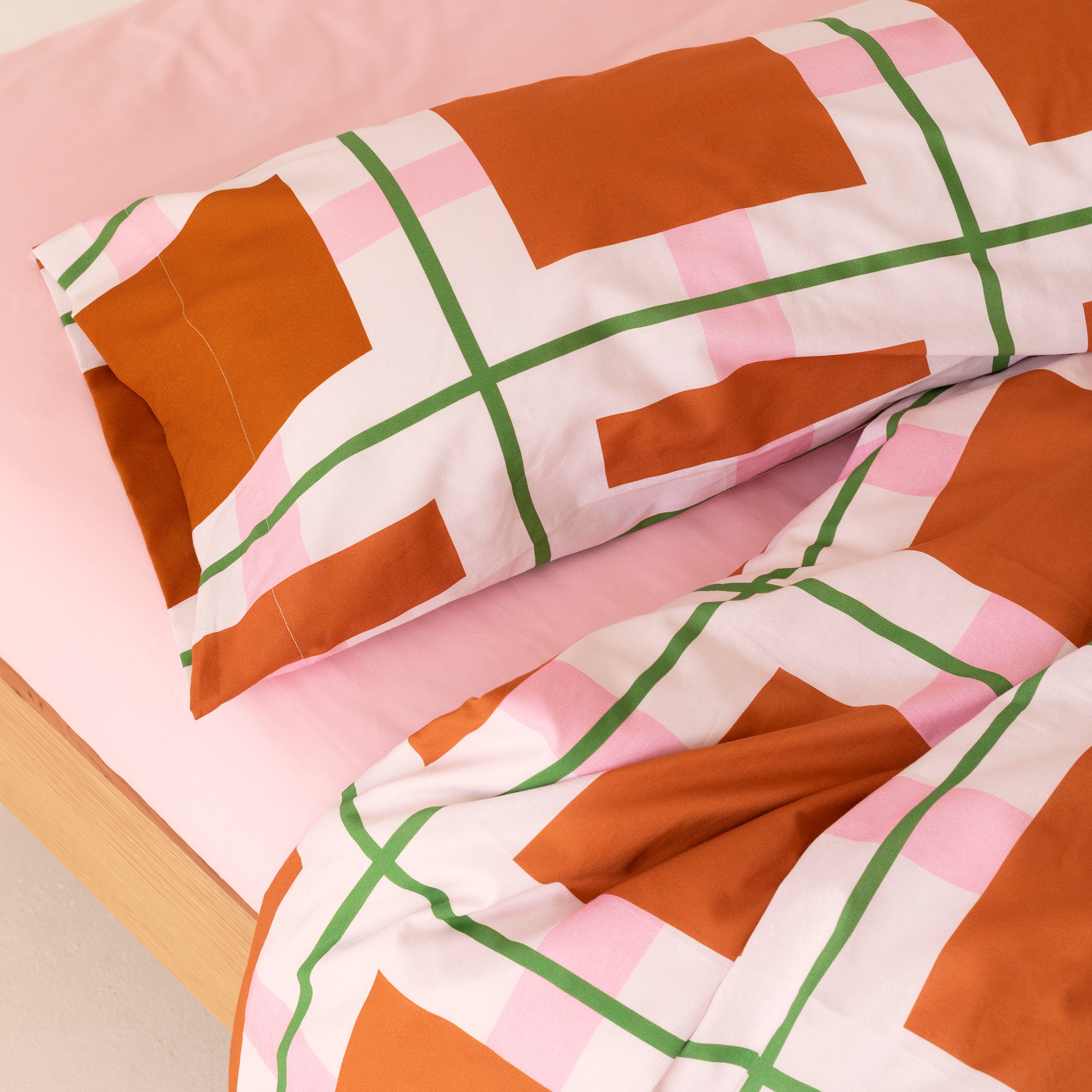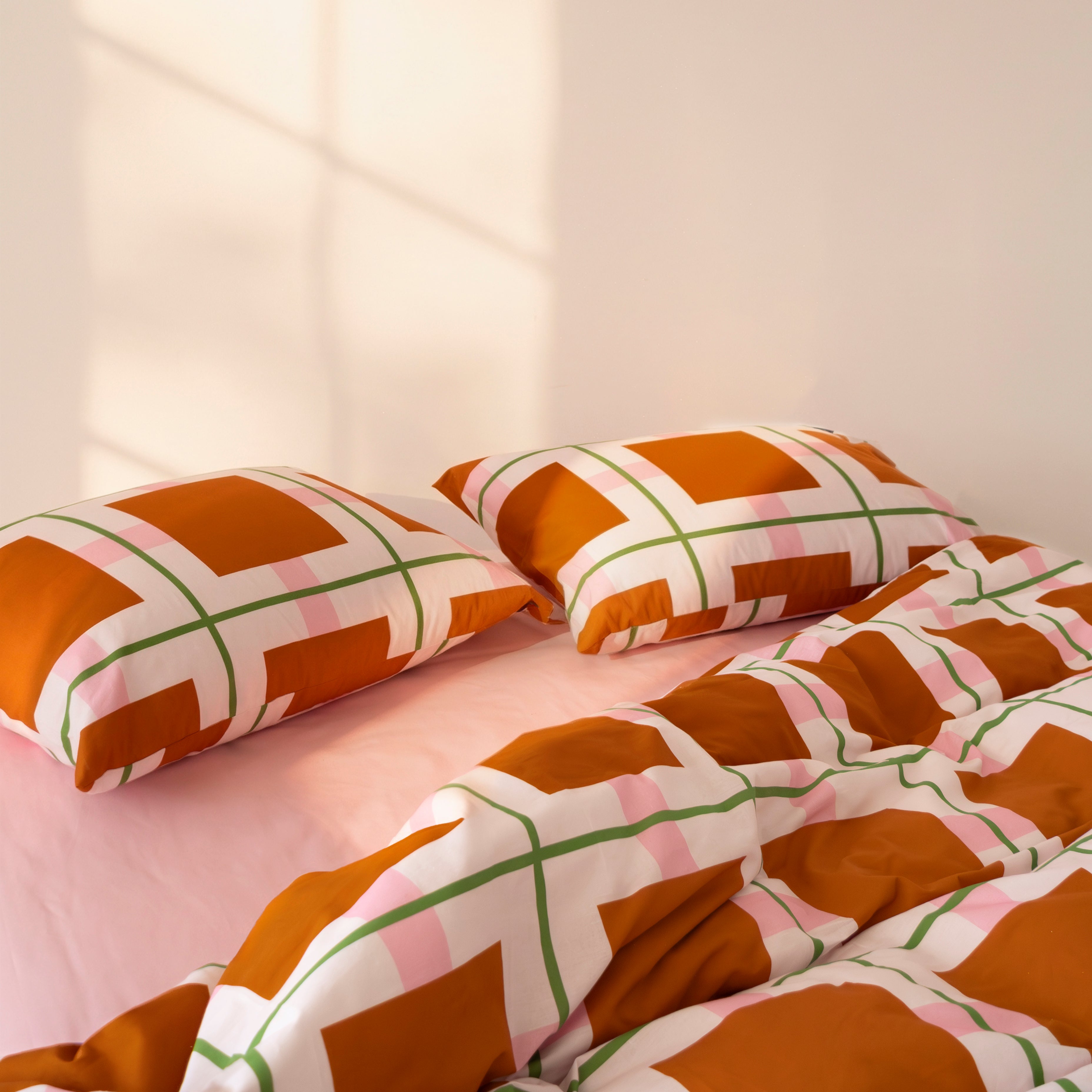 La funda de almohada Retro Arty añade un acento gráfico que combina la estética setentera con un enfoque fresco. Su composición de líneas cruzadas y bloques de color aporta ritmo, estructura y una pincelada creativa al conjunto.